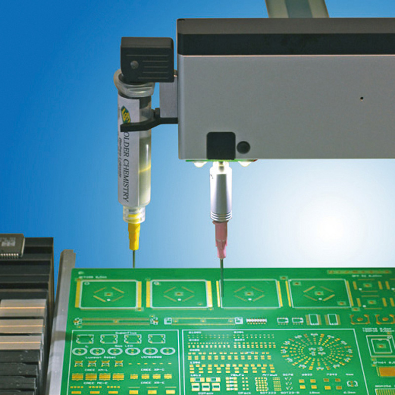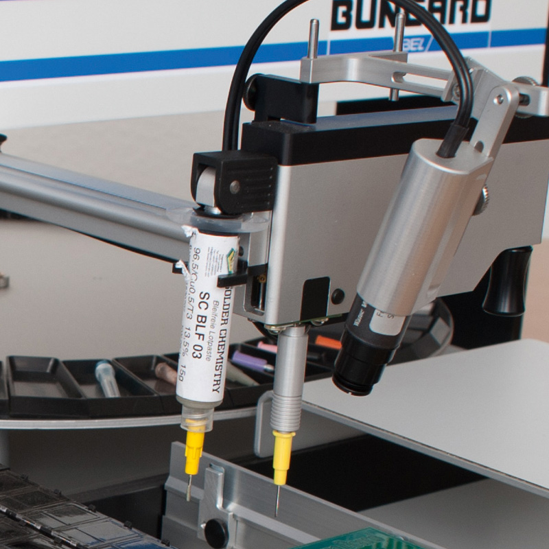 Manipulator for the production of prototypes and small series. The patent-registered Pick & Place head enables the comfortable handling of SMD-components. The modular-built system can be confi gurated for every use. It realizes the complete process – starting by dispensing of solder paste or glue up to assembling different components.